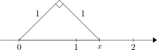 Talan $x$, sem er hliðarlengd langhliðarinnar, er rauntala og skv. reglu Pýþagórasar gildir að \[ x^2 = 1^2 + 1^2 = 2. \] Hippasus sannaði að engin ræð tala geti uppfyllt þessa jöfnu og þar með er talan $x$, sem oftast er táknuð með $\sqrt{2}$, óræð tala.