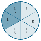 Dæmi: Gerum nú ráð fyrir að heildin sé hringurinn á myndinni að neðan og skiptum henni í $6$ jafna hluta. Þá er annaðhvort hægt að segja að stærð $2$ slíkra hluta miðað við heildina sé $\frac26$, eða að þessir $2$ hlutar séu $\frac26$ af heildinni. Með öðrum orðum er annaðhvort hægt að segja að dökka svæðið á myndinni að neðan hafi stærðina $\frac26$ miðað við heildina, eða að það sé $\frac26$ af heildinni.
