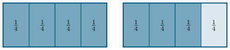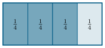 Dæmi: Látum heildina vera rétthyrninginn á myndinni að neðan og skiptum henni í $4$ jafna hluta. Þá getum við annaðhvort sagt að stærð $3$ slíkra hluta miðað við heildina sé $\frac34$, eða að þessir $3$ hlutar séu $\frac34$ af heildinni. Með öðrum orðum getum við annaðhvort sagt að dökka svæðið á myndinni að neðan hafi stærðina $\frac34$ miðað við heildina, eða að það sé $\frac34$ af heildinni.
