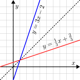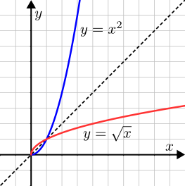 Dæmi: Fyrri myndin að neðan sýnir graf fallsins $f: \mathbb{R} \to \mathbb{R}$; $f(x) = 3x - 2$ og andhverfu þess $f^{-1}: \mathbb{R} \to \mathbb{R}$; $f^{-1}(y) = \frac{1}3 y + \frac{2}3$ úr fyrra dæminu að ofan. Seinni myndin sýnir graf fallsins $g: [0, \infty[ \to [0, \infty[$; $g(x) = x^2$ og andhverfu þess $g^{-1}: [0, \infty[ \to [0, \infty[$; $g^{-1}(y) = \sqrt{y}$ úr seinna dæminu að ofan.
