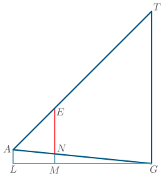 Ef sá sem stendur út við styttuna stendur á punkti $L$ og sá sem heldur á mælistikunni stendur á punkti $M$, þá er hægt að mæla lengdir strikanna $LM$ og $LG$. Þessi strik eru hæðir í þríhyrningunum og lengd þeirra má nota, ásamt lengd $EN$, til að reikna allar aðrar hliðar í þríhyrningunum.