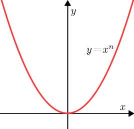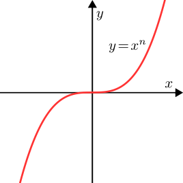 | Veldisfallið $f(x) = x^n$, $n$ slétt tala og $n \geq 2$, $x \in \mathbb{R}$ | Veldisfallið $f(x) = x^n$, $n$ oddatala og $n \geq 3$, $x \in \mathbb{R}$ |