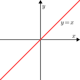 | Samsemdarvörpunin $f(x) = x$, $x \in \mathbb{R}$ | Algildisfallið $f(x) = |x|$, $x \in \mathbb{R}$ |