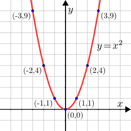 Dæmi: Skoðum fallið $f: \mathbb{R} \to \mathbb{R}$; $f(x) = x^2$. Graf þess er mengið sem samanstendur af öllum tvenndum af gerðinni $(x,f(x)) = (x,x^2)$ þar sem $x \in \mathbb{R}$, þ.e. \[ G_f = \{(x,x^2) \mid x \in \mathbb{R}\}. \] Eins og lýst er að ofan má teikna grafið í hnitakerfi með því að merkja inn alla punkta sem hafa hnit $(x,x^2)$. Nokkur dæmi um punkta af þessari gerð eru $(-3,9)$, $(-2,4)$, $(-1,1)$, $(0,0)$, $(1,1)$, $(2,4)$ og $(3,9)$. Á myndinni að neðan hefur graf $f$ verið teiknað í hnitakerfi með rauðum lit og eru punktarnir sjö að framan blálitaðir. Grafið er síðan merkt með jöfnunni $y = x^2$.