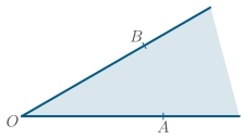 Dæmi: Myndin sýnir eiginlegt horn með oddpunkt $O$ og arma $\left.OA\right>$ og $\left.OB\right>$. Skyggða svæðið er innaní horninu.