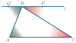 Sönnun: Látum $l$ vera línuna í gegnum hornpunktinn $B$ sem er samsíða hliðinni $AC$. Þá fást þrjú horn með oddpunkt $B$ sem samanlagt mynda beint horn. Látum $P$ og $Q$ vera punkta á $l$ sem liggja hvor sínum megin við $B$ og þannig að $P$ sé innaní $\angle A$. Grænu hornin á myndinni, $\angle QBA$ og $\angle A$, eru innanverð víxlhorn við samsíða línur og því eins. Rauðu hornin á myndinni, $\angle CBP$ og $\angle C$, eru líka innanverð víxlhorn við samsíða línur og því einnig eins. Við höfum þá að \[|\angle A|+|\angle ABC|+|\angle C| = |\angle QBA|+|\angle ABC|+|\angle CBP| = |\angle QBP|=180^\circ.\]