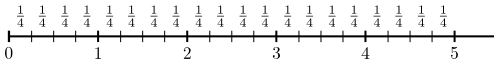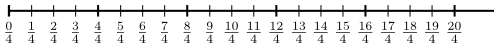 Núna setjum við brotið $\frac04$ á sama stað og töluna $0$ á talnalínunni, brotið $\frac14$ setjum við á þann punkt talnalínunnar sem fæst með því að fara eitt skref af lengdinni $\frac14$ frá $0$, brotið $\frac24$ setjum við á punktinn sem fæst með því að fara tvö skref af lengdinni $\frac14$ frá $0$, o.s.frv. Eftir það lítur talnalínan svona út: