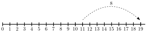 - Ef við notum þriðju samlagningaraðferðina, sem er að nota talnalínu, byrjum við í tölunni $11$ á talnalínunni og spyrjum okkur: Hversu mörg einingarskref þurfum við að fara frá tölunni $11$ á talnalínunni til að komast yfir í töluna $19$?