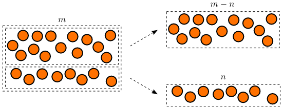 Við getum einnig hugsað frádrátt á aðeins annan hátt. Í stað þess að hugsa okkur að við höfum safn af $m$ hlutum og fjarlægjum $n$ hluti úr því getum við allt eins hugsað okkur að við skiptum $m$ hluta safninu í tvo hópa, þar sem annar hópurinn hefur $n$ hluti. Fjöldi hluta í hinum hópnum er þá augljóslega $m-n$.