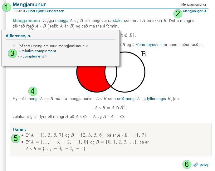 Ef bendillinn sveimar yfir orði sem er grænt, þá sprettur upp gluggi með vísun í Orðaskrá Íslenska stærðfræðafélagsins. Þar kemur fram enskt heiti hugtaksins og þær vísanir sem það hefur í orðaskránni. Á myndinni sést meðal annars að enska nafnorðið „difference“ er notað yfir mengjamun. Hægt er að smella á orðin í glugganum til að skoða viðkomandi færslur í orðaskránni.