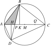 Miðstreng $AC$ í hring er skipt í fjögur jafnlöng strik með $P$, $M$ og $Q$. Dregin er lína um $P$ sem sker hringinn í $B$ og $D$ þannig að $2|PD|=3|AP|$. Hvert er flatarmál ferhyrningsins $A B C D$ ef flatarmál þríhyrningsins $A B P$ er $1$?