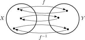Skilyrðin tvö í $(\ast)$ að ofan segja með öðrum orðum að fyrir sérhver $x \in X$ og $y \in Y$ gildi að \[ f^{-1}(f(x)) = x \quad \text{og} \quad f(f^{-1}(y)) = y. \] Þetta sýnir að andhverfan $f^{-1}$ hefur einmitt öfuga verkun við $f$, því $f$ varpar stakinu $x \in X$ í stakið $f(x) \in Y$ og $f^{-1}$ varpar stakinu $f(x)$ aftur í upphaflega stakið $x$ skv. fyrri jöfnunni. Sömuleiðis hefur $f$ öfuga verkun við $f^{-1}$, því $f^{-1}$ varpar stakinu $y \in Y$ í stakið $f^{-1}(y) \in X$ og $f$ varpar stakinu $f^{-1}(y)$ aftur í upphaflega stakið $y$ skv. seinni jöfnunni. Áhrifin af því að beita $f$ og $f^{-1}$ hvorri á eftir annarri eru því engin, sem endurspeglast í Venn-myndinni að neðan.