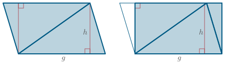 Til þess að finna flatarmál samsíðungsins, þá tökum við eftir að hægt er að skipta honum upp í fjóra rétthyrnda þríhyrninga. Með því að raða þessum rétthyrndu þríhyrningum upp á nýtt eins og á myndinni til hægri fáum við rétthyrning með hliðar af lengd $g$ og $h$. Flatarmál rétthyrningsins er þá $gh$, það er jafnt flatarmáli samsíðungsins sem aftur er tvöfalt faltarmál þríhyrningsins. Við ályktum að flatarmál þríhyrningsins sé þá $\frac{1}{2}gh$.