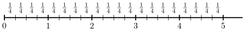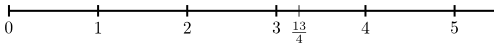 Síðan setjum við brotið $\frac{13}4$ á þann punkt sem fæst með því að fara $13$ skref af lengdinni $\frac14$ frá tölunni $0$.
