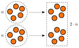 Byrjum á að skoða margfeldið $2 \cdot n$. Samkvæmt skilgreiningunni á margföldun fæst $2 \cdot n$ með því að sameina tvö söfn af $n$ hlutum í nýtt safn og finna heildarfjölda hluta í því, eins og myndin að neðan sýnir.