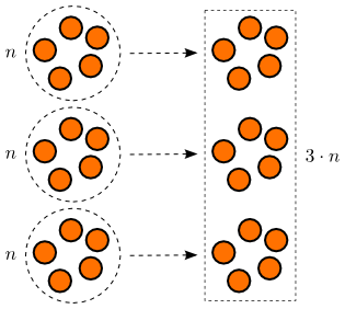 Skoðum nú margfeldið $3 \cdot n$. Samkvæmt skilgreiningunni á margföldun fæst $3 \cdot n$ með því að sameina þrjú söfn af $n$ hlutum í nýtt safn og finna heildarfjölda hluta í því, eins og myndin að neðan sýnir.