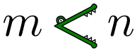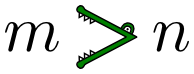 Eins og sést notum við í raun sama merkið til að tákna að $m$ sé stærri en $n$ og að $m$ sé minni en $n$, nema það snýr á ólíkan hátt í hvoru tilviki fyrir sig. Einföld leið til að muna hvernig merkið á að snúa er að ímynda sér að það sé ginið á svöngum krókódíl. Krókódíllinn vill að sjálfsögðu fá sem mest að borða og þess vegna opnar hann ginið að stærri tölunni (hún lýsir fleiri hlutum).