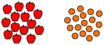 - Ef við klárum bæði eplin og appelsínurnar, þá eru eplin jafnmörg og appelsínurnar og þess vegna er $m = n$.
