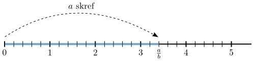 Tökum eftir því að bláa strikið skiptist í $a$ minni strik, sem hvert hefur lengdina $\frac1b$, svo lengd bláa striksins er greinilega $\frac{a}b$. Þess vegna getum við sagt: