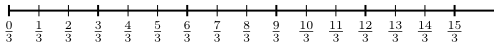 Núna setjum við brotið $\frac03$ á sama stað og töluna $0$ á talnalínunni, brotið $\frac13$ setjum við á þann punkt talnalínunnar sem fæst með því að fara eitt skref af lengdinni $\frac13$ frá $0$, brotið $\frac23$ setjum við á punktinn sem fæst með því að fara tvö skref af lengdinni $\frac13$ frá $0$, o.s.frv. Eftir það lítur talnalínan svona út: