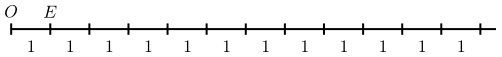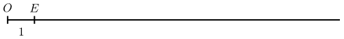 Við byrjum á að velja eitthvert einingarstrik, þ.e. strik sem hefur lengdina $1$, og köllum endapunkta þess $O$ og $E$. Síðan framlengjum við strikið $OE$ í hálflínu með upphafspunkt $O$, eins og myndin að neðan sýnir.