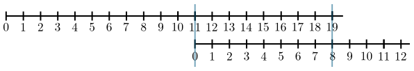 Við sjáum að við þurfum $8$ skref til að komast frá $11$ til $19$, svo mismunur talnanna $19$ og $11$ er $8$. - Ef við notum loks fjórðu samlagningaraðferðina, sem er að nota tvær talnalínur í sameiningu, leggjum við upphafspunkt seinni talnalínunnar við töluna $11$ á fyrri talnalínunni og látum báðar talnalínur snúa í sömu átt. Síðan spyrjum við okkur: Hvaða tala á seinni talnalínunni lendir á sama stað og talan $19$ á fyrri talnalínunni?