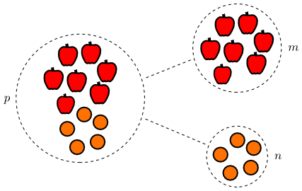 Segjum að við höfum þrjú söfn af hlutum þar sem fjöldi hluta í söfnunum eru $m$, $n$ og $p$, eins og myndin að ofan sýnir.
