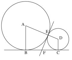 Á myndinni má sjá hring með miðju í $A$ og geisla $9$, og annan minni hring með miðju í $D$ og geisla $4$. Sameiginlegir snertlar $B C$ og $E F$ eru dregnir. Ákvarðið lengd $E F$