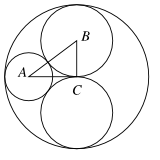 Þrír hringir með geislann $1$ og einn stór hringur eru lagðir eins