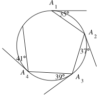horn við snertil við hringinn í punktinum $A_1$. Síðan heldur hann í átt að punkti $A_3$, en hornið á milli $A_2A_3$ og snertils í $A_2$ er nú $37^\circ$ (sjá mynd). Svona heldur þetta áfram nema hvað að hornið á milli $A_kA_{k+1}$ og snertils við hringinn í $A_{k}$ er nú $(33+2k)^\circ$.